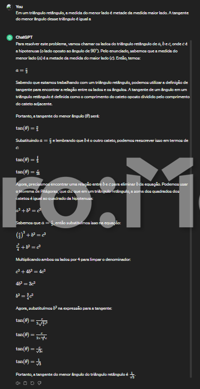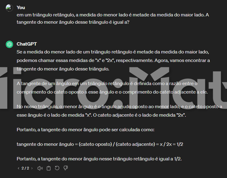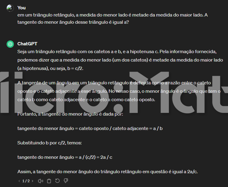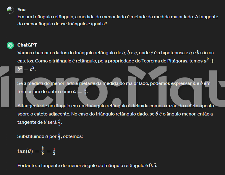 O menor ângulo de um triângulo retângulo é sempre oposto ao menor lado e não adjacente como afirmou a inteligência artificial. É possível saber e demonstrar isso pela Lei dos Senos que determina, para um triângulo retângulo qualquer, que a relação do seno de um ângulo é sempre proporcional à medida do lado oposto a esse ângulo. A prova da Lei dos Senos fica para outro artigo.